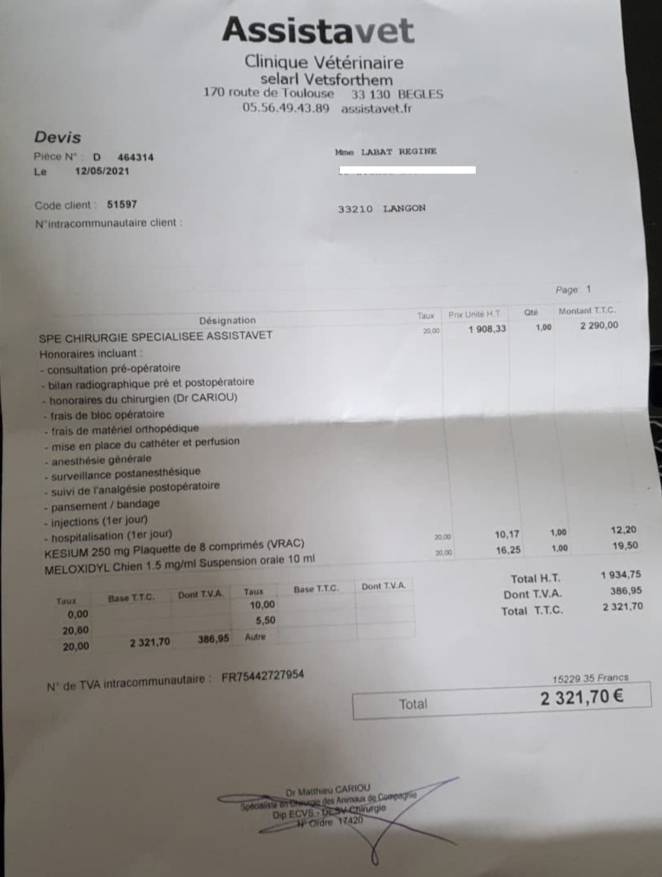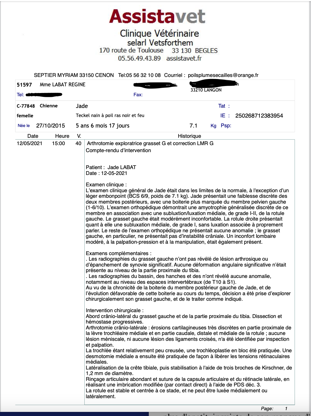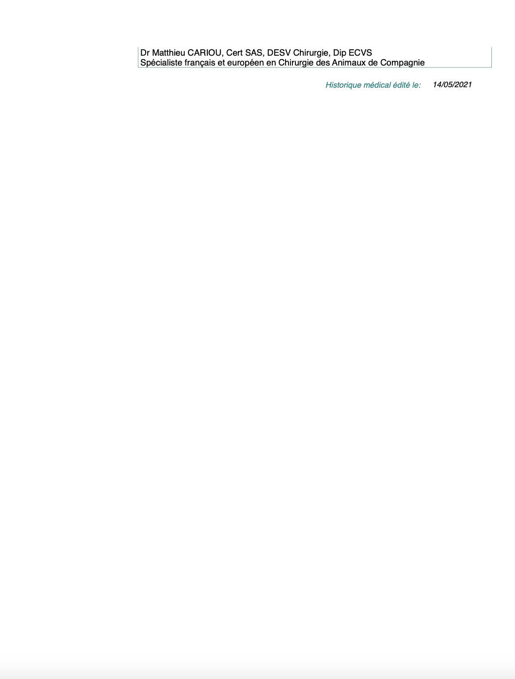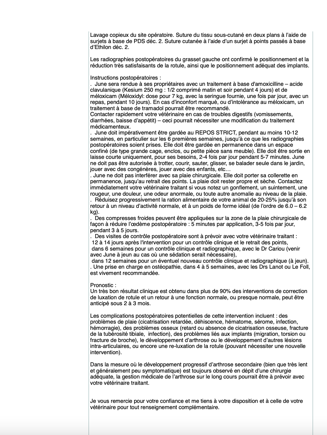 Je vous remercie pour votre confiance et me tiens à votre disposition et à celle de votre vétérinaire pour tout renseignement complémentaire.