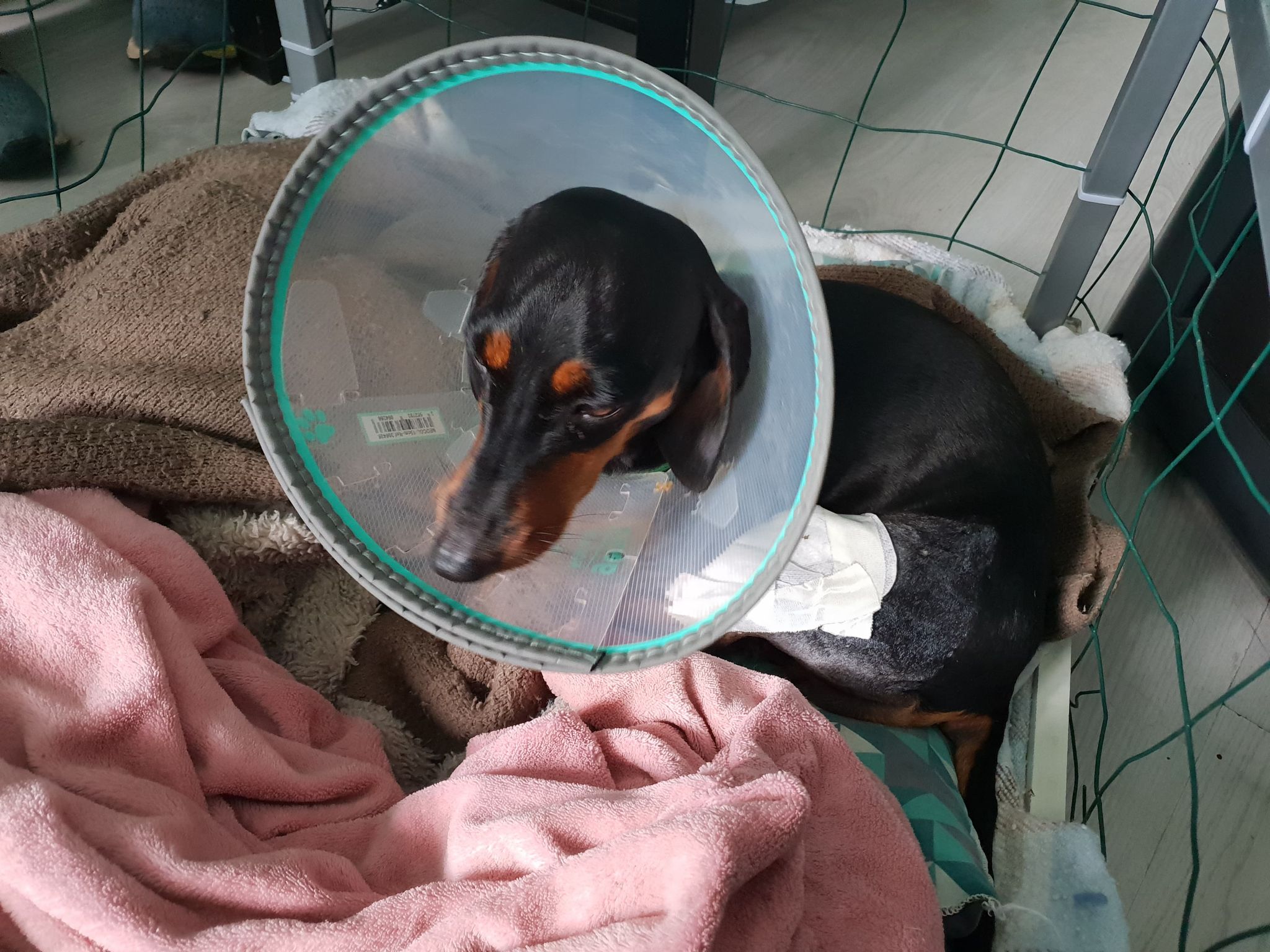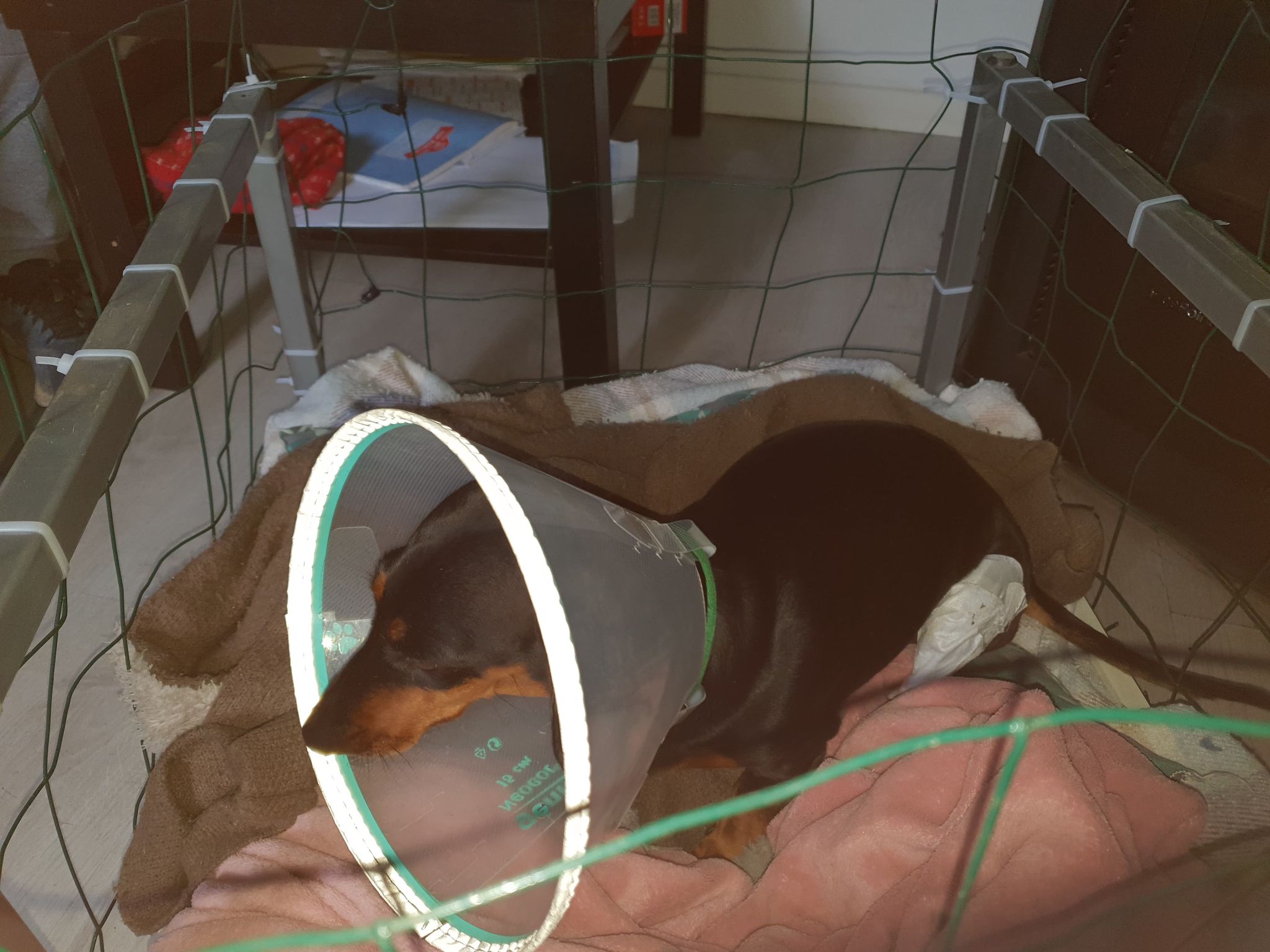 Jade doit impérativement être gardée au REPOS STRICT, pendant au moins 10-12 semaines, en particulier sur les 6 premières semaines, jusqu’à ce que les radiographies postopératoires soient prises. Elle doit être gardée en permanence dans un espace confiné (de type grande cage, enclos, ou petite pièce sans meuble). Elle doit être sortie en laisse courte uniquement, pour ses besoins, 2-4 fois par jour pendant 5-7 minutes. June ne doit pas être autorisée à trotter, courir, sauter, glisser, se balader seule dans le jardin, jouer avec des congénères, jouer avec des enfants, etc...
